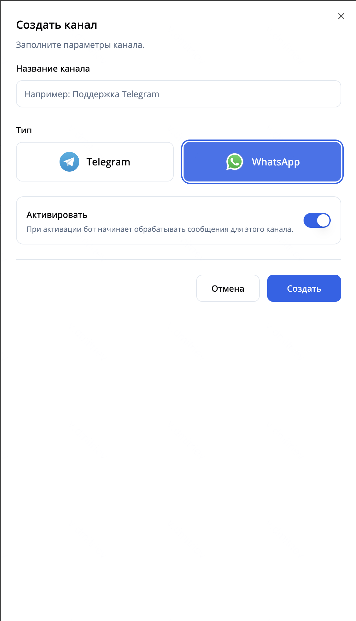 - Выберите "Тип" -> WhatsApp и нажмите кнопку "Создать"